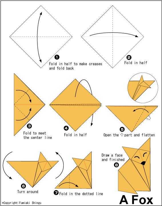 Guided Practice: This next origami creature can be made during the same lesson or at the next lesson depending on how quickly the students are getting it. Now we are gonna try making a fox! Once again I will guide the students through each fold assisting when needed and reviewing and checking for progress after each step. Example checking for understanding questions: Whose second fold looks like a diamond? Is anyone having trouble with this fold? If you are not ready to move on to the next fold please raise your hand.