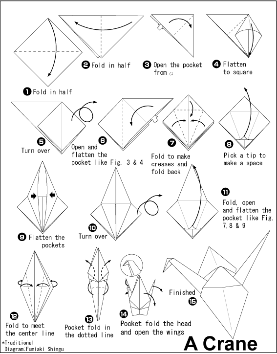 Guided Practice: This next origami creature can be made during the same lesson or at the next lesson depending on how quickly the students are getting it. Last we are gonna try a crane. They can be really difficult so let's get our ears on and ready to listen. Crane’s can be especially difficult so we will go slower and pace ourselves. Using questions and dialog to assist as well as walk around to help students who are struggling. From fold six to fold seven our crane should go from looking like a square to looking kind of like a sparkly diamond. The number eight fold can be tricky so let’s take our time using gentle hands. Raise your hand if you need some help or ask your tablemates for some cooperation if you think you missed something.